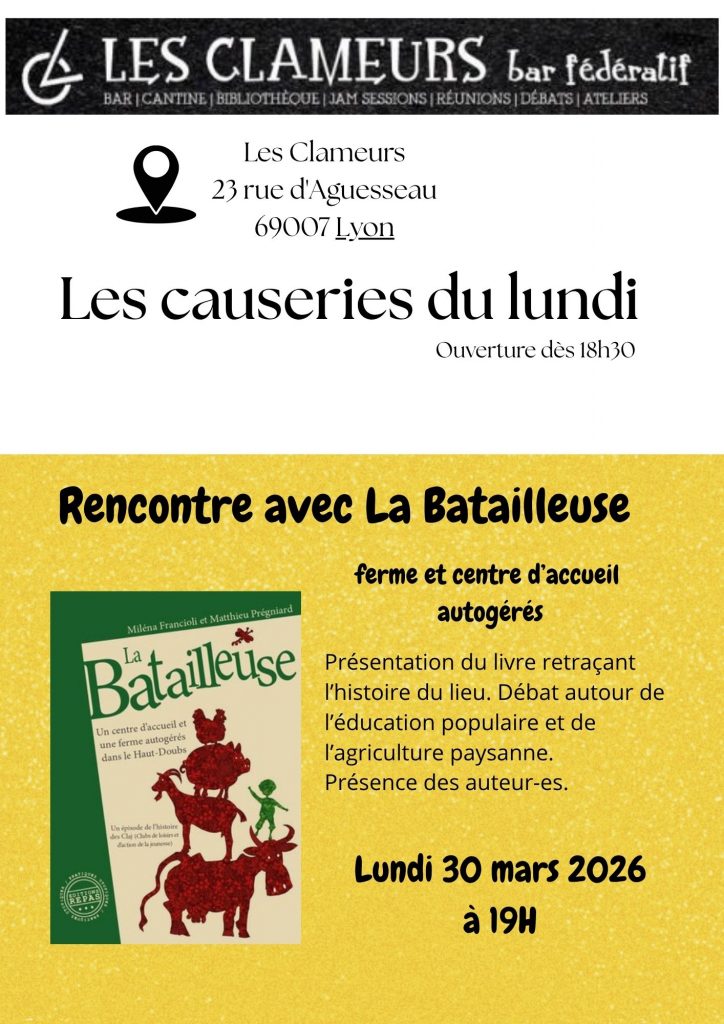 Lundi 30/03/26 : présentation/débat au bar les Clameurs, à Lyon 7, 19h.